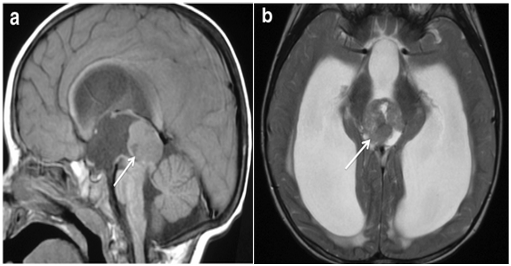 Figure 1. MRI Brain showing tumor arising from the pineal gland (a) Sagittal T1 weighted image (b) Axial T2 weighted image. |