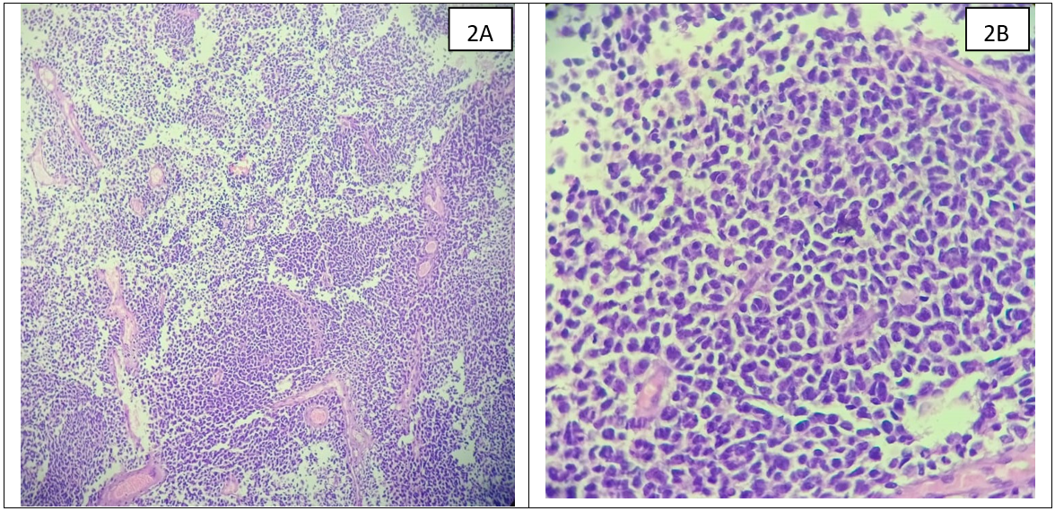 Figure 2. (A) The tumor shows sheets of densely packed cells with perivascular pseudo-rosette formation. (B) Tumor cells with hyperchromatic angular nuclei, scanty cytoplasm, and brisk mitosis. |