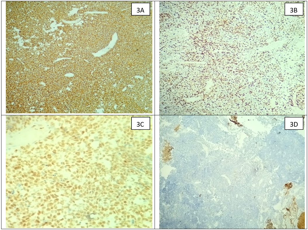 Figure 3. Immunohistochemistry stains (A) Tumor cells are immuno-reactive for synaptophysin, (B) High Ki 67 proliferative index. (C) Retained nuclear expression of INI 1. (D) Tumor cells are non-immune reactive for GFAP. |
