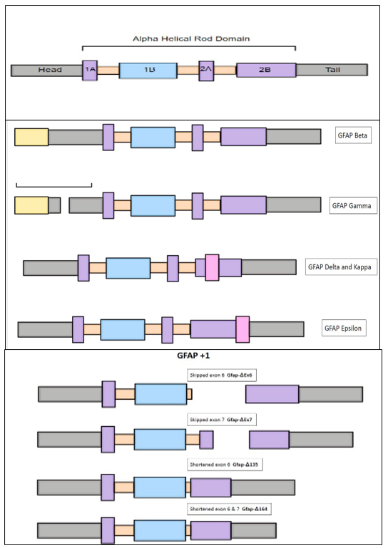 Figure 1.Structure of principal isoform of GFAP and alternate isoforms: The structure of principal isoform GFAP- α is composed of head, rod, and tail domain. GFAP-α, GFAP-β, GFAP-γ, GFAP-δ, GFAP-κ, and GFAP-ζ are the different isoforms that were widely expressed in the cortex, striatum, and cerebellum. These isoforms are derived by alternative splicing of GFAP- α. The pathological relevance of these uncommon GFAP isoforms in the context of AD disease pathogenesis is open to question and needs further investigation. But some of these isoforms were implicated in the pathogenesis of neurological diseases including Alexandria disease, astrocytoma, and glioblastoma. |