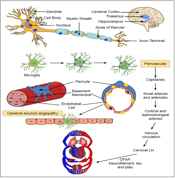 Figure 2. The pathological basis for emigration of GFAP and other toxic aggregates from brain circulation into blood: Amyloid deposits accumulating on the neuronal cells is primarily engulfed by scavenging microglial cells. These microglial cells then regurgitate these toxic aggregates upon the vascular endothelium of micro-vasculature thus triggering the onset of vasculitis and blood-brain barrier (BBB) dysfunction. The escape of GFAP from the brain circulation into the systemic circulation is dependent upon the presence of BBB dysfunction as well as its passage through the glymphatic and vascular pathways. The presence of an obstruction in these excretory clearance pathways can impede the efficient migration of GFAP in the systemic circulation, thus preventing it ability to be used as a biomarker for mirroring disease changes in AD. |