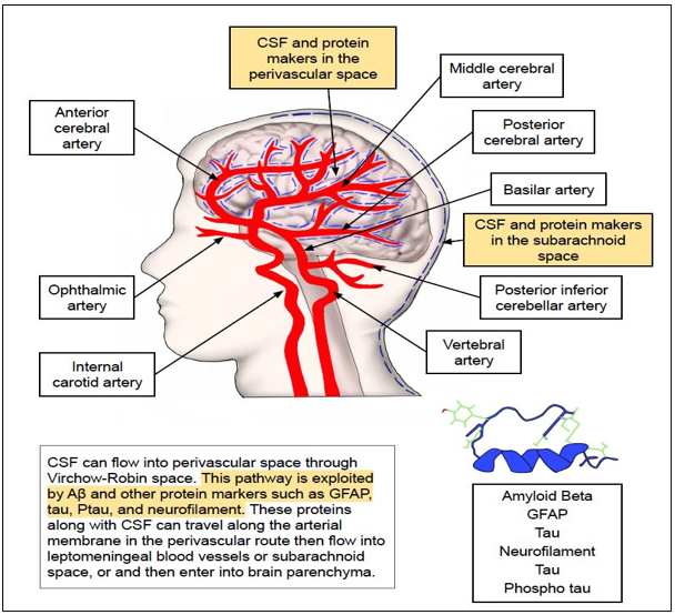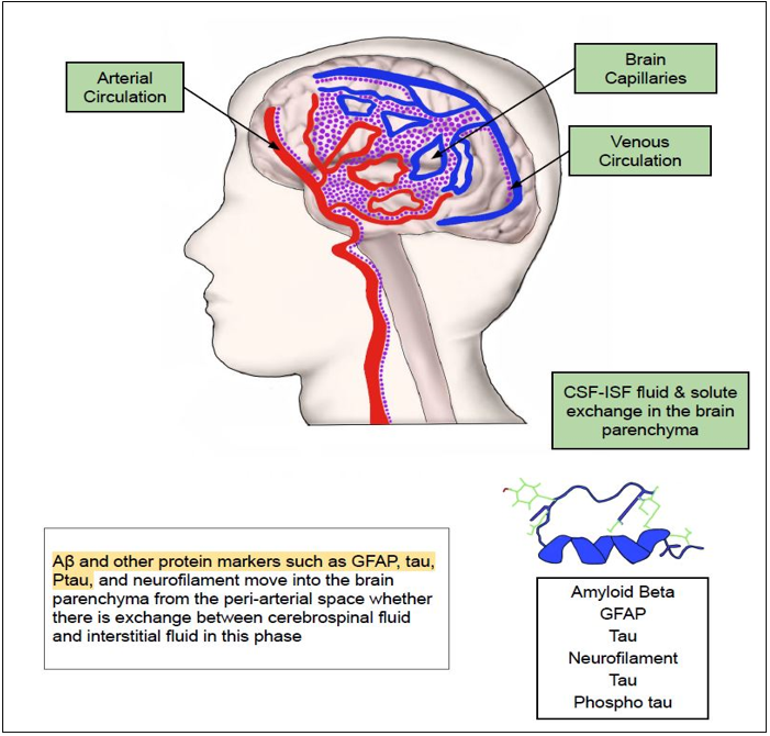 Markers such as GFAP, tau, synuclein, neurofilament and amyloid beta can passively slide through along the basement membrane of the smooth muscle of microvasculature in a peri-vascular route and drain into the cervical lymph nodes (LNs)(81, 82, 89, 92, 93). This peri-vascular route is energized by the low frequency peri-arterial pulsations and spontaneous vasomotion which was recently demonstrated with in-vivo two-photon microscopy by van Veluw SJ et al(94, 95). Additionally, respiration and CSF pressure gradients were known to play atleast a partial role in rapid inter-exchange of fluids between CSF and ISF(96, 97). Other physiological factors that are hypothesized to play a significant role in the operation of perivascular and glymphatic clearance pathways include APOE*ε4, arterial age, molecular size /weight of solutes, AQP4 expression and sleep(98).