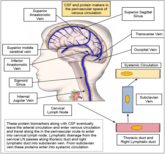By intrathecal administration of contrast agents, researchers were able to visualize the peri-arterial CSF influx and CSF-ISF fluid changes in the extracellular space of the rat brain with the help of dynamic contrast-enhanced MRI(106). By sliding across venous circulation these solutes are eventually transported to the cervical LNs by (peri-venous efflux). Once they enter the lymphatic circulation, these are emptied into the right lymphatic duct and thoracic duct. From the lymphatics, these solutes are drained into the sub-clavian vein and finally into the systemic arterial circulation.