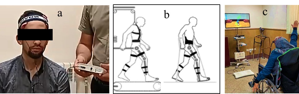 Figure 1. Examples of the new technological-based approaches for physical therapy in MS; a) Transcranial Electrical Stimulation (tES), b) Robotic Devices for Gait Training and c) Virtual Reality Training (VRT).