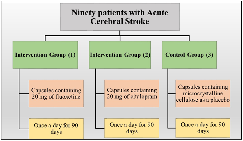 However, there are no sufficient findings for this case in clinical studies, especially in Iran (31-33). Since stroke is a disease that affects people's lives and causes a high economic and psychological burden for the patient and the treatment system, clinical studies have not fully confirmed or rejected the use or non-use of selective serotonin reuptake inhibitor drugs. Therefore, the aim was to investigate the effect of citalopram and fluoxetine on motor function after stroke in acute cerebral stroke patients referred to Shahid Beheshti Hospital in Kashan in 2021-2022.